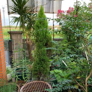 我が家のシンボルツリーその3🌲 今、危険な状態ゴールドクレスト❣️ 孫達にクリスマスツリーを見せたくて🎄 それが、今年の長雨と暑さで茶色くなり 主人に日除のシートをしてもらいました。(その間に茶色くなった部分をカット) この木がメダカの瓶の日除になっているのですが心配です💦