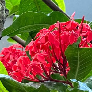 鮮やかな緋色の萼片に守られるようにして咲いていた、「緋衣崑崙花(ヒゴロモコンロンカ)」で、おはようございます😉❣️ "緋衣崑崙花"は、コンゴなどの熱帯アフリカ原産のアカネ科の非耐寒性常緑低木🇨🇩 クリーム色に限りなく近い白い花部は、子供の頃に遊んだ紙風船で膨らませたような小さな筒状で、中心部の赤いポイントも可愛いらしい花姿が印象的です🎯🍃 土壌環境が良いのでしょうか❓ 生い茂る緑の葉は、今夏も夏枯れすることなく、天高く生き生きと生長していました🌿✨ ー別名は、「サマーポインセチア」。 ー花言葉は、「特別な存在」、「神話」…他。
