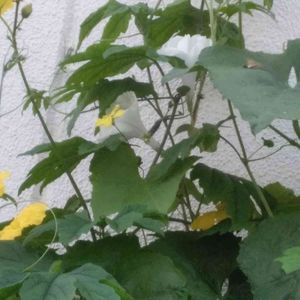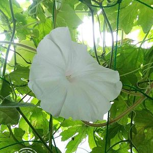 ヘチマに紛れて 頑張って咲いてる白い朝顔。😊バックが 白い壁で 映えないなあ😂残念。