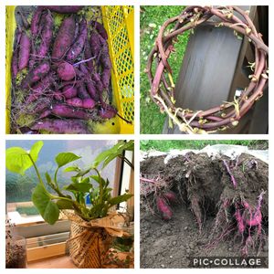 さつまいもも娘にせがまれ、結局全部収穫。 スーパーの一つの芋から芽出し苗採りをし、小さめですが30個以上の芋が採れました。 さつまいも栽培には涼しい北海道、おまけに日当たりの悪い我が家でこれだけとれれば満足です。 ツルの先端の葉茎は収穫し、ご近所にも配り歩きました。ツルのリースも作ってみました。 捨てられない病により、つる先は水挿し中です。笑