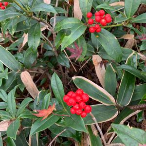 《ミヤマシキミ》でした。 先日、自分で別場所のミヤマシキミを投稿していました。 恥ずかしい(*/□\*) 投稿されているものを拝見すると、若干違うような気もするのですが… 《ピラカンサス》で合ってますでしょうか?