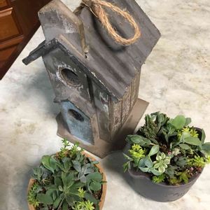 また遊びに来る友人のために、寄せ植え作ってみました‼️同じような写真になってしまうので、買って来て木に取り付ける前の、巣箱と一緒にパチリ‼️