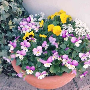 アリッサム、ガーデンシクラメン、ビオラの寄せ植え。アリッサムがのびのびしていま~す♥️