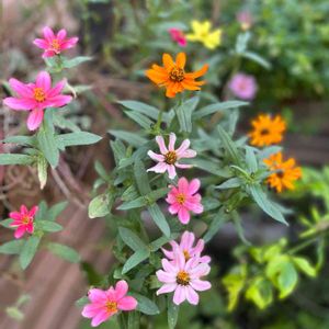 種まきで育てたお花🧡百日草(ジニア)だと思いますが、袋の写真とちょっと違う😳濃い模様が付いていて個性的です🎯