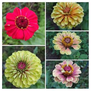 百日草(ジニア)🌸🌿 今年種まきの‘クィーンライムブロッチ’が様々花姿を変えて咲いています✨💖 ↖絞り咲きの‘ポップアート’さんの種から咲いた子は真っ赤な子でした♥️😲 百日草は昨年より種蒔きから育てていますが、変化に富んでいて楽しいです♪