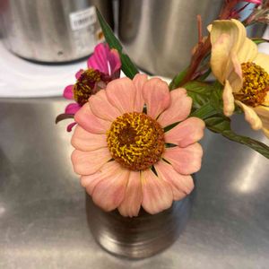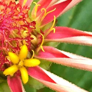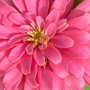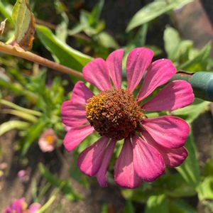 百日草(ジニア) 🌼✨ 外側の花弁がなかなか開き切らず(開花から1日経ってるのに😅)、 花びらストローみたいなままのうちに、 黄色の筒状花の方が開いちゃいました😅 暑さのせいなのか、コスモスもだけど、最近時々、「ん?」て花が見られます😓 でも頑張ってる🌼✨🌸✨