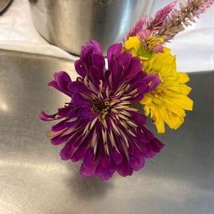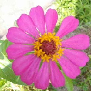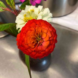百日草(ジニア) 🌼✨ おはようございます☀️ 今朝は涼しめでした😌 今年2度も花びらだけ食べられた🐝🐦、このカラーの百日草…… まだ全開ではないですが、今1つ大輪を咲かせてます✨ 食べられないよう早めに切り花に、とも思うのですが、 見事な大輪なので、ちょっと迷い中🌀 このまま自然に咲かせといてあげたくもある…… でもまた食べられたら、たぶん泣く……