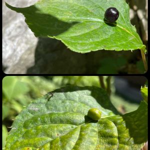 ハナイカダ(花筏) ハナイカダ科 ハナイカダ属 5~6月 1~3m 落葉低木 在来種 雌雄異株✨ ハナイカダの果実(液果)が黒っぽく熟していた (画像5枚目は7月中旬に撮影、まるで麦チョコ) 葉を見ると、果実が乗っかっている中心付近までの主脈の部分が太く色も違うのが肉眼でもよく分かります もともと葉腋から出ていたであろう花序軸が主脈と合着するように進化したのだそうです 花の直径は4~5mm 雄株では雄花が数個まとまってつき、雌株では雌花はふつう1個(ときに2~3個)つくそうです 花が小さいことは特に珍しいわけではない気がしますが、数が少ないですよね… 雌雄異株なので、受粉にはより多くの飛翔する昆虫が訪花してくれる方がいいけれど、仮にふつうに伸びた花序軸の先に4~5mmの花が1個だけついている状況をイメージすると、そこに止まれる昆虫はとても限定的になりそうだし、そのような小さな昆虫が雄株から雌株へうまいこと辿り着けるかというとなかなか確率は低くなりそうです 葉を足場にできる現状のスタイルは、花より大きい昆虫にとっても訪花しやすく、受粉効率がグンと上がっているように思います 果実を初めてみたけれど、まだ花を見たことがないんですよね(笑) 来年は是非とも花を見てみたい😊 調べてみると、果実も虫えい(虫こぶ)であることが多いそうですね… 生食できて、ほんのり甘いそうですよ…