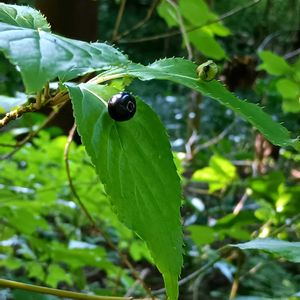 ハナイカダ(ハナイカダ科) 北海道南部〜九州の丘陵から山地の林内や湿り気のある沢筋に生える落葉低木 山道脇のハナイカダの果実は森の中でも目立ち 生き物?鳥達?は好んで食べるようです ⑤ 7/5はまだ緑の果実でした 若い果実は稜がある(この時はあまり目立たないですが) 葉っぱ🌱の舟に黒豆●が乗っていて可愛らしい姿です💕 8/5