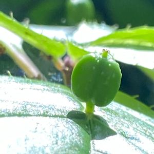 ハナイカダ(花筏) 長い花柄をもつ花が葉腋から生えていたのに いつしか葉の上に重なって合体してしまった。 よく見ると花柄のレールがあります。 雌花の後にできた実はやがて黒く熟して、 鳥たちが葉っぱの上にご馳走だ〜と食べるそう。 植物って本当におもしろい🤗