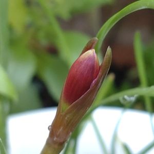 ゼフィランサス プライドオブシンガポール やっと蕾が出ました。買った年は咲いたけれど、他のレインリリーの葉に圧倒されて、去年は、咲くことができませんでした。掘り出して、鉢に埋めました。やっと復活です。