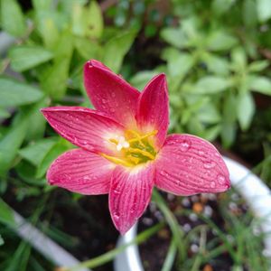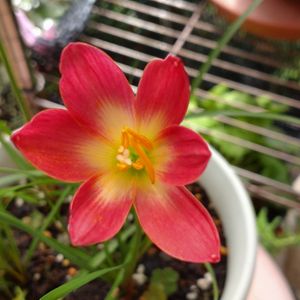 ゼフィランサス プライドオブシンガポール 2輪目 昨日の雨で、蕾が首を曲げていたから、雨の当たらないところに避難しました。