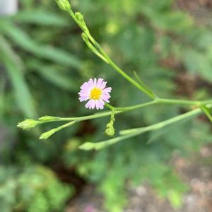 朝のゴミ出し時に通るお家の前🏠 いつ咲くかと楽しみにしてましたが、今日咲き始めました🌸 直径5㎜ほどの小さな花が可愛いすぎる😆❣️ ヒメムカシヨモギと思いますが、葉に鋸歯が無く無毛🌿ケナシヒメムカシヨモギにしては、総苞片に斑点が無い🤔 ハイブリッド?