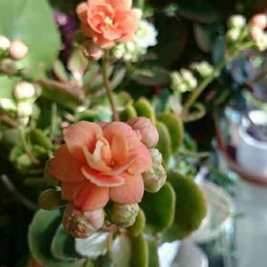 八重咲きカランコエも満開✨ でも花芽が徒長しちゃって、ちょっと不恰好Σ(-∀-;) 真南の窓辺にいてこれって… 冬場の短日で花芽を付けるくせに、耐寒性弱で屋内限定だし、なかなか難しいなぁ(-""-;)
