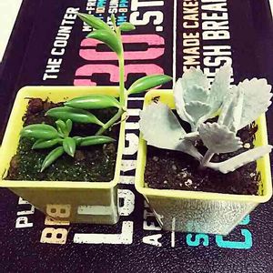 ダイソー産の多肉さん。 GSの書き込みなど参考にさせて頂くと アーモンドネックレスか三日月ネックレス?と白銀の舞。 お名前合ってるかな? ネックレスさんの土は苔が生えてるけど湿度高くないですか?ぷりぷりで元気そうだけど.......。