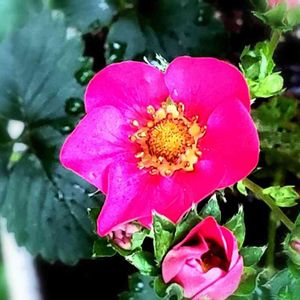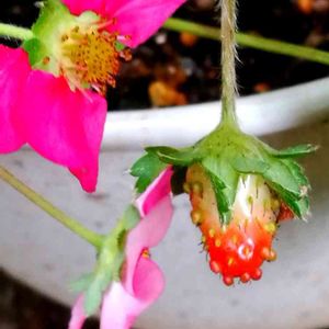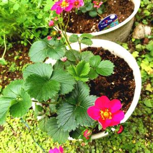 ピンクの花のはずなのに いつの間にか濃い桃色に どうしたの可愛いイチゴ 花を訪れる 蜜蜂に恋をして 恋桃色に変わったの 🍓やっとなり始めたイチゴ収穫が楽しみ🍓 一つの株を株分けして育ててるイチゴなんですが、もう一つの鉢のイチゴはみんな薄いビンク色で、この鉢のイチゴも最初はピンクだったのに、だんだん濃い桃色に変化して、どこまで濃くなるのか楽しみにしています🎵 一日お疲れさまでした、今日も素敵な夜を🎵