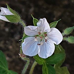 白いお花を3つ 1つ目と2つ目 ハコベホオズキ 繁縷酸漿 ナス科ハコベホオズキ属の多年草 南アメリカ原産 明治時代中期 小石川植物園に導入されたものが逸出し関東地方以西から中国地方に帰化 花期は 7月中旬~10月 スズランに似た小さな鐘形のお花 長さ7〜9mm 花径5〜6mmくらい 花冠の先は5裂しクルンと外巻きカールで かわいい♡ 俯いてるお花をクイっと持ち上げて覗いてみると… 雄蕊は5個が中心に集まって合わさってるようです。黄色いのが葯。雌シベは1個で 黄緑色の柱頭。 茎が蔓のように地面を這ったり 他の植物を覆ったり 登ったりしてよく茂り大群生する。 このコとの出会いは 去年の10月、舎人公園野草園の裏手の方で けっこう広がっているのを 見っけました。名札がなくどうやら勝手に蔓延っていたようで、後に果実を見ようと思い行きましたが しっかり刈られてました。 そして 今年も 同じ時期に 咲いてるかなぁ?って行ってみると咲いてました。おそらくこの後バッサリーノの運命でしょうね。 かわいいんですけどね~困ったちゃんになってはいけないので、仕方ないですね。 お名前の由来は 葉っぱが ハコベに似た、ホオズキの仲間という意味のようです。ホオズキ??姿からは ピンときませんが、学術的にナス科でホオズキに近い種類なのだそうです。 撮影 2024 10/14 都立舎人公園野草園 3つ目 シロバナゲンノショウコ白花現の証拠 フウロソウ科フウロソウ属の多年草 在来種 西日本ではピンク、東日本では白色が多いそうですね。 私がゲンノショウコに会えるのは いつも小石川植物園や赤塚植物園なので ありがたいことに どちらにも会えます。 今回は舎人公園野草園の寄り添うニコイチの白いコを。 撮影 2024 10/14 都立舎人公園野草園 4つ目 シロバナツユクサ 白花露草 ツユクサ科ツユクサ属の一年草 在来種 ツユクサの白花品種 なかなか出会えない 白いコに会えたので気分爆上がりっ! 撮影 2024 10/14 都立舎人公園野草園