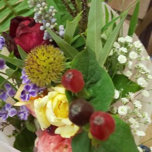 お誕生日会の花束を皆の家から持ちより、作りました。私のはデュランタ宝塚とオリズルランの子でした。切り花が少ないので今度は沢山植えとこ‼️