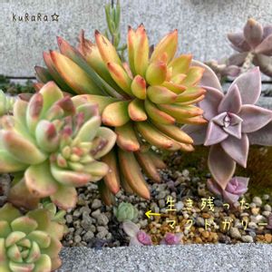 先月の大寒波で沢山の多肉がカチコチに凍りました😓特に酷かったのがマクドガリー( ; ; )全滅かと思われましたが。。。 巨大なサンライズマムが屋根代わりになって、凍らずに生き延びたマクドガリー見っけ👈👀 ちなみに、サンライズマムもカチコチに凍ったので、痛々しい凍った後😓 身を呈して、マクドガリーを守ってくれてありがとう✨✨ これぞ、多肉の友愛💕 がしかし、 こちらの花壇は、多肉の強者しか生き残れない場所なので💦 救出しますか😅