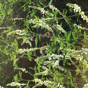 白花品川萩(シロバナシナガワハギ)/小米萩(コゴメハギ) マメ科シナガワハギ属の1年草。道端や荒れ地に生える中央アジア原産の帰化植物。スイートクローバーの名で牧草として導入されたが、経済的に栽培されるには至らなかった。葉は倒披針形の3小葉からなる複葉、小葉の縁には鋸歯があり、裏面に伏した毛がある。茎は直立してよく分岐し、高さ1.5m以上になる。花期は6~8月。葉腋に花穂を出し、白色の蝶形花を密につける。豆果に亀の甲羅のような網目状のくぼみがあるのが特徴。 本種は小米萩(コゴメハギ)の別名もある。これは、白い小さな花を米粒に見立てたもの。本種の仲間で、よく似た黄色い花を咲かせる帰化植物の品川萩(シナガワハギ)は、江戸時代末期に東京の品川付近で最初に発見されたためについた名前。東京湾の埋立地ではシナガワハギよりシロバナシナガワハギのほうが多く見られる。 出展典『日本帰化植物写真図鑑』『野に咲く花』