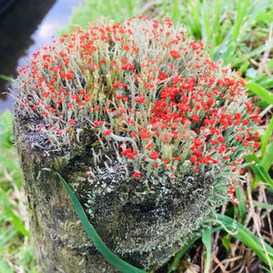 コアカミゴケ (コナアカミゴケ) 古い木の柵に地衣類のモンローリップ💋胞子の入る子器が赤い必要があるのか、化学成分がこの色を出すのだといわれればそれまでだけれど、この色と形を選択したことにはなにか意味があるのだろう🟥 名称について、コナとコは違う、いや統一された、コナはコに、逆にコはコナにとネット情報大混乱だが、2004年3月、日本地衣学会発行「日本産地衣類および関連菌類のチェックリスト」によると、Cladonia macilenta コアカミゴケが筆頭に出てきます😃ま、どっちでもよいけど(´^ω^)