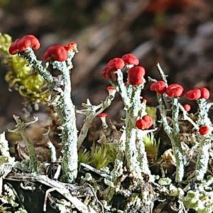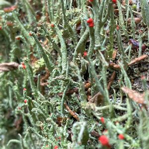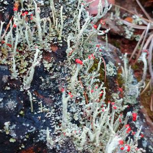 粉赤実苔 コアカミゴケ ハナゴケ科 ハナゴケ属 分布 本州 四国 九州 沖縄 樹状地衣類 低地〜高山地帯までの腐朽木や腐植土のある岩上などに生育する。 粉芽に覆われた長さ1〜3cm程の子柄の先に赤い子器をつける。 ちょっと離れた丸い切り株上に生えていましたのでハッキリ撮れませんでした。