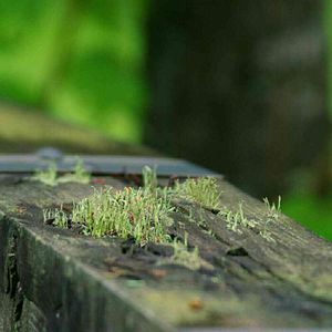 畑の杭のてっぺんに、たぶん苔の仲間だと思うものが。 コアカミゴケと教えて頂きました😊