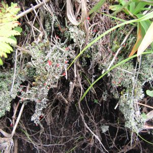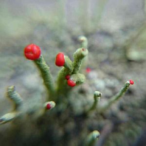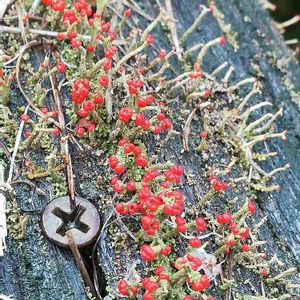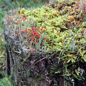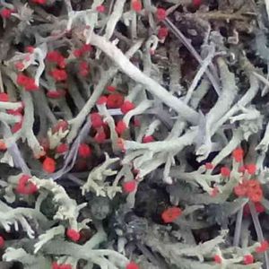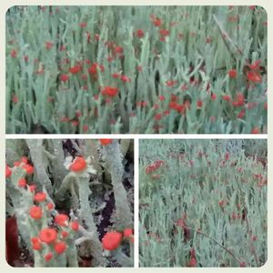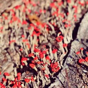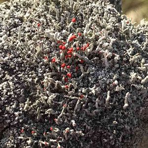 コアカミゴケ(地衣類) コケって名前がついてるのにコケ類ではなく厳密にな植物でもないらしい。 そして赤い花がついてると思って調べてみると、どうやら花ではなく子器らしい。 藻類と菌類の共生生物らしいがよくやからん。初めて見た。