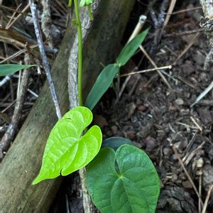 里山の道で、観葉植物みたいなつやつやのきれいな葉っぱ。 ⬆️は、花芽? 葉芽? ツル性植物かな? 見たことのない植物です。 踏まれそうな場所だったので、周りを太い枯れ木で囲んでおきました。 エマニエルさんに名前教えていただきました。 ありがとうございます😊