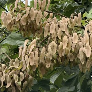 今朝の散歩道🚶♂️🚶♂️ 時折り歩いているコースなのに 初めて気付いた 「アオギリ」青桐 の果実ですが 子房が裂開し、その一片の舟形の裂片の葉状の縁辺に小さな球状の種子が付いている。 来年は花の開花を見たいものです