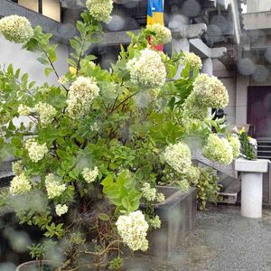 車の中から、納骨堂とカシワバ アジサイかな?まだ咲いていました