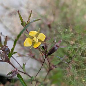 ヒレタゴボウ(鰭田牛蒡)アカバナ科チョウジタデ属 ヒレタゴボウ、4年ぶりに会えました。 黄色の大きなお花です。 葉っぱはもう紅葉し始めてました。 丈は~1mくらいになります。 茎はよく分枝し、4稜があり、翼があります。 葉は披針形で先が尖り、基部は円形、無柄。 花は4弁花で、直径約2.5cmほど、花弁間に隙間が出来ます。 雄しべは8。 萼裂片は三角状で果実になっても残ります。 果実は断面が四角の筒状形で長さ2cm。