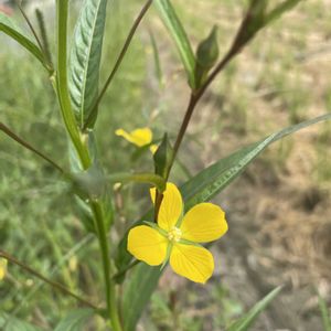 ヒレタゴボウ(鰭田牛蒡) 別名 アメリカミズキンバイ *アカバナ科チヨョウジタデ属 花期は8〜9月 熱帯アメリカ原産で関東以西の水田や湿地などで多く見られる帰化植物の一年草! 高さは50〜100cm 葉はほぼ無柄で互生し披針形〜狭楕円形! 花は黄色の4花弁で葉腋に単生し花弁の間は隙間がある! ①②花弁の間は隙間! ③茎の断面は四角で翼(ヒレ)がある! ④萼片が残る四角い蒴果! ⑤大きめの株! 名前は 茎に発達するヒレ(翼)とタゴボウは在来のチョウジタデの別名「田牛蒡」から。 今年初めて見た在来種のチョウジタデよりずっと大きな花でした❗️ 10月8日撮影 千葉県山武市