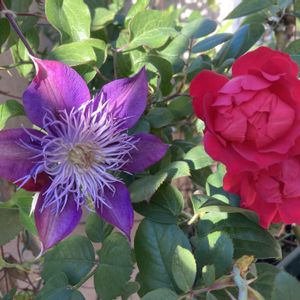 クレマチスフェアリーブルー💜 1輪だけ秋に咲いてくれました😍 新旧両枝咲き う〜んんん…剪定がわからん💦 with 🌹チェリーボニカ♡♡ かわいいよぉー (⌯'ᵕ'⌯)´-