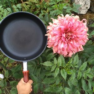 ダリア 天涯。 直径27cmのフライパンと比較… …んー、フライパンより小さい😓 目指す30cmはなかなか大きな壁ですね。 二番花はコレ以上にはならないかなぁ…💦 来年以降も挑戦します!