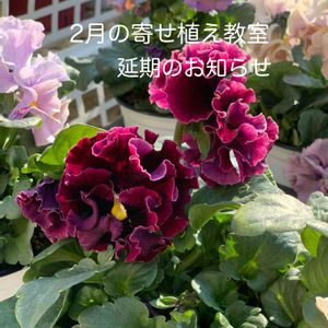 ビオラのこんもり寄せ♪ 1/24に予定していました寄せ植え教室ですが、この度新型コロナウイルスによる緊急事態宣言が発令された為、今月は教室の開催を中止(可能ならば延期)とさせて頂きます。楽しみにされていたお客様には大変申し訳ありません。。。 今後もSNS等で教室のお知らせや入荷情報など発信していくので、よろしくお願い致します✩︎⡱