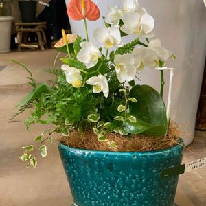 胡蝶蘭と観葉の寄せ植え作りました♪ 水やりのタイミングが違うので、胡蝶蘭はビニールポットのままスッポリ植っています。胡蝶蘭の水やりは控えめに。。。😌 こちらは出ている限りになります。残り数個ですのです。敬老の日やお祝いなどにいかがでしょうか💕
