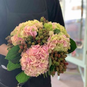 本日入荷のアジサイです❁︎ 生花担当ayaさんと可愛い〜を連呼☺️ 小さい頃良く近所で食べた桑の実も一緒に束ねたら、あら素敵✨