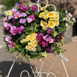 プリムラとビオラのハンギングバスケット♪ 次々咲きます!! 玄関先に店舗入口に、贈り物に( ˘͈ ᵕ ˘͈ )いかがですか? 制作:hosoya