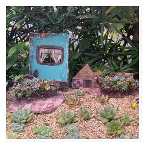 新しく作った箱庭風。 水色のは、昨日の雨で、半分溶けちゃった! (>_<) (T_T) 粘土の材質を忘れていたわ。 寄せ植えの台は、セリアのプラスチックのチェアーを、エイジング加工して、またまたネルソルで固めて作りました。 前面は、アガボイデス系中心に植えてあります。