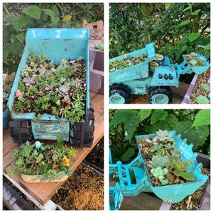 ダンプカーにチビ苗を寄せていたけれど、夏越しが難しくて、殆ど枯れてしまったので、新しくそこら辺にあるチビ苗を植えてみた。 電池を入れたら動くのですが、動かせて私ら老夫婦が一回楽しんで終了。リメイクしました。