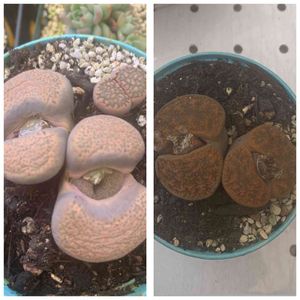 リトープスですが、11月に花を咲かせた時に、 早くカットしなくちゃ、苗に負担が掛かると思い、早々にカットしたら、 茎が枯れて行かなくて、挟まったまま今に至ります。 最近、シワがより始めて来て、口が開いて来ました。 良く考えれば、リトープスは、脱皮をするんだから、早くカットしなくても良いんじゃ無いかと思います。…(^^;) 不細工な格好のままにさせてしまって、ごみんよ!m(_ _)m