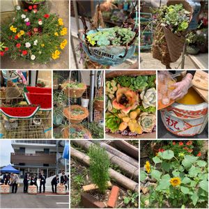 サボり気味なGSですが、\(//∇//)\。 まとめて、アップしちゃいます! …(^^;) 左上、松葉牡丹に肥料をあげたら、立派な株になり、ビックリ‼️😅 上中、右上、中左、多肉の鉢をオーブン粘土で作ったり。 中、畑の小屋に3段のザルがあったので、リメイク。 中、寄せ植えしたら、ジュレて真ん中から、腐って来てしまったり、(>_<)。 中右、左下、集落活動センターの落成式で、お酒の代わりに、私らの仲間が販売しているポンカンのジュースが使われてるので、見に行ったり。 下中、今年のコキアをレンガで囲って、除草剤被害に遭わない様に防御したり、 右下、ミニひまわりを種からおこして開花を楽しんだり、 粗大ゴミ置き場がある所から、ワゴンやミニチュアハウスなどを貰って来たりして、リメイクを楽しんだりして居ます。 また、リメイク出来たらアップします。 \( ˆoˆ )/