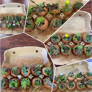 もらったドラゴンボールの壺に、オリヅルランとグリーンネックレスを。 室内でOKなんで。 平飼い卵のケースにヤシファイバーを敷いて、卵殻に多肉を植えてみました。 とても可愛くて、評判良かったです。 (*^o^*) リメ缶に寄せたのを植え直して、これも持って行きました。 売って欲しいと言われますが、値段の付け方が分かんないので、見せる専門です。 \(//∇//)\