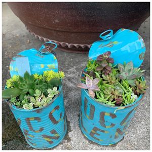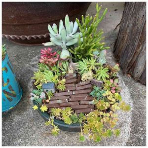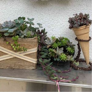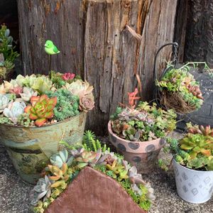 仕立て直ししました。 リメ缶やら、粘土で作った鉢、プリン?なんかのプラ鉢利用しております。 寄せ植えのテーマは無いです。