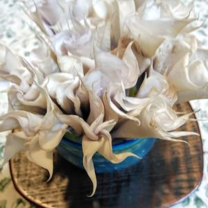 洋種朝鮮朝顔の咲き殻 こんなに、行儀のいい花は、初めて。 5裂した花びらを、折りたたみながら、花びらを閉じていく。 わあ~👀 綺麗だ! 花がらを、拾って来たよ。 グラスにいれてみた。 折りたたみ傘? 美しいな。