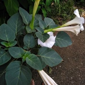 シロバナヨウシュチョウセンアサガオ 白花洋種朝鮮朝顔 五分咲きの印象。 これで満開。 開くのは、朝で無く、 夕方から。 毒にも薬にもなる。