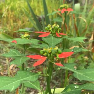 💚❤️野に咲く花❤️💚 杯状花序……合着してカップ状 になった総苞の中に 退化した雄花と雌花が包まれる。 花に花弁はありません 雌性先熟で 雌花が先に成熟する ✳️花期になると 苞葉の基部が 赤く色づきます🎶✳️ 猩猩草(しょうじょうそう) 別名 サマーポインセチア トウダイグサ科