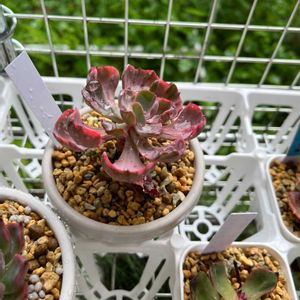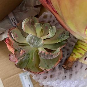 2025/09/22、エケベリア ハートディライト錦。 初の大型エケベリアです。 白・赤・緑の色のコントラストと レンゲスプーンの様な葉がクルンとカールしているのが可愛いです。 13cmのカット苗で届きました。 ちょこっと焼けが見られます。 痛みは見られませんが、しっかり乾かして植えたいと思います。