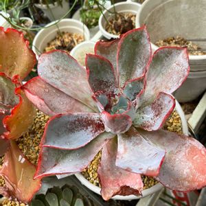 2025/11/26、エケベリア、紅葉中。 入手時は緑緑していたエケベリアラックが 徐々に赤や紫になってきています。 どの株も葉の数が増えて盛り盛りです。 全ての鉢に緩効性肥料を与えています。 肥料を与えてこの紅葉ぶりなので 与えていなかったら、もっと濃くなっていたのでしょうか。